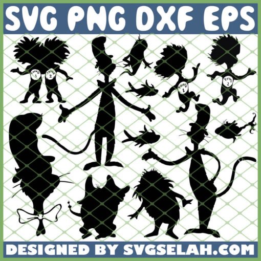 A: This comprehensive bundle features silhouettes of The Cat in the Hat, Thing 1, Thing 2, The Fish, and several other delightful Dr. Seuss-inspired characters, offering a wide range for your creative projects.